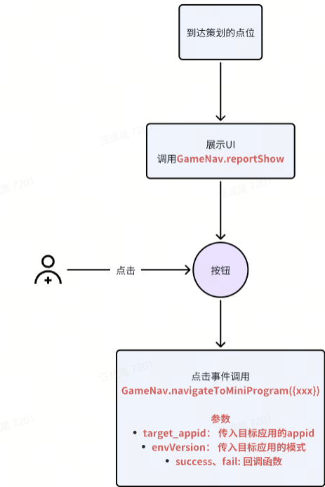 对UI绑定点击事件,点击发生时调用GameHelper.GameNav.navigateToMiniProgram(opt)。传参说明