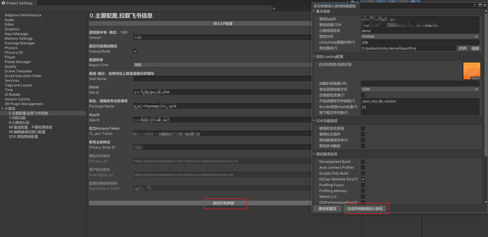 Unity 菜单栏选择:ZMYSDK => 游戏配置 => 小游戏 => 前往打包界面
